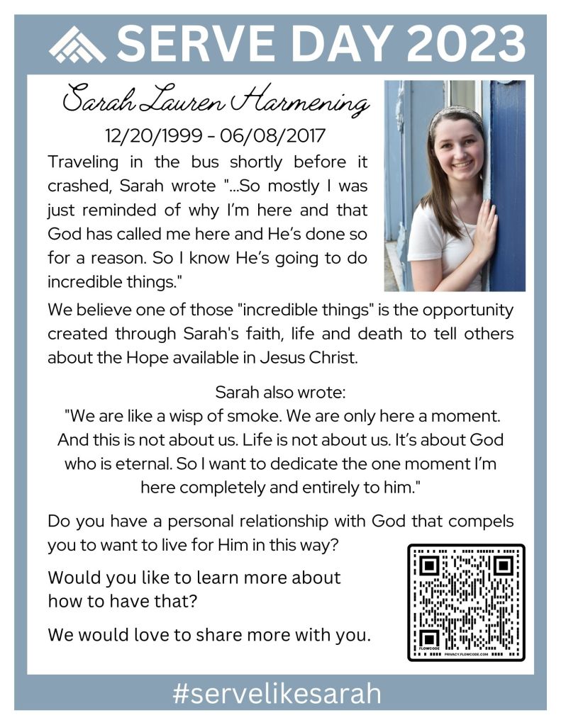Scott and I are excited to be co-leading a Serve Day Team with Tanner and Haley Bell. Tanner and Haley were on the bus when it crashed and they share our passion for seeing God glorified through our shared testimonies of His faithfulness and provision in the midst of the resulting suffering, sorrow and distress.